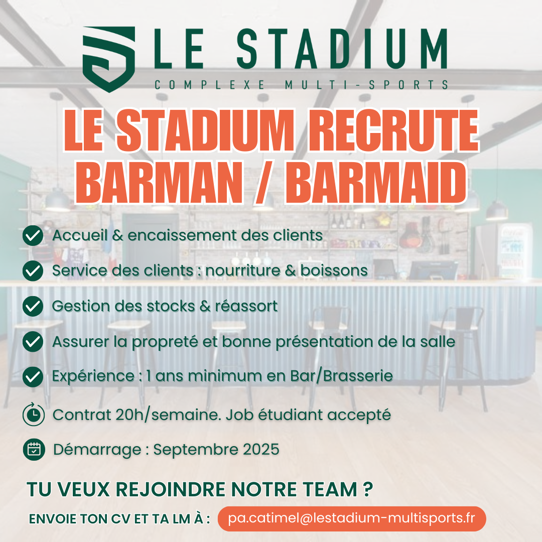 🗣️LE STADIUM RECRUTE ! Rejoins notre super team en septembre prochain en tant que BARMAN/BARMAID ! 🍺
